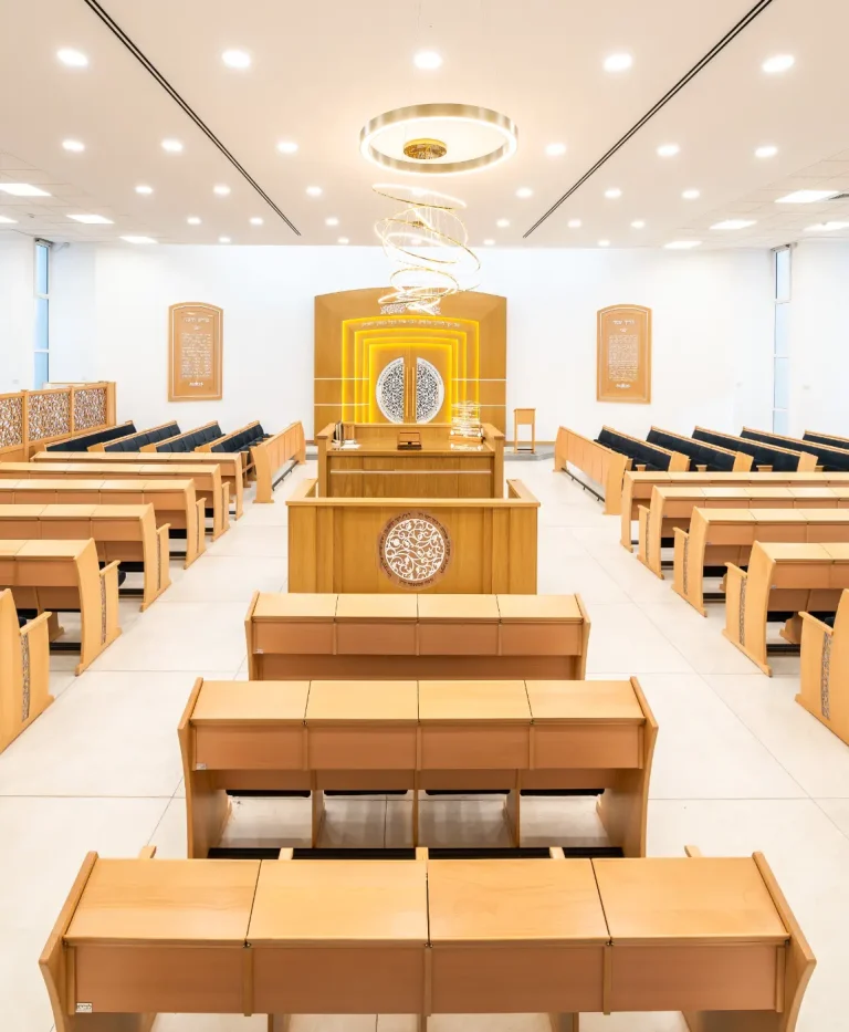 For this project, we designed a cohesive and distinctive line of furniture for the synagogue, creating an environment that envelops everyone upon entry with a unique atmosphere. The selection of a deep wood stain serves to accentuate contrast and showcase the silver art pieces. Our choice of employing state-of-the-art technologies, including laser and CNC cutting, allowed us to seamlessly blend traditional styles with modern precision. The outcome is a collection of products characterized by clean lines, exuding a luxurious and triumphant aesthetic. The following products were featured in this project: