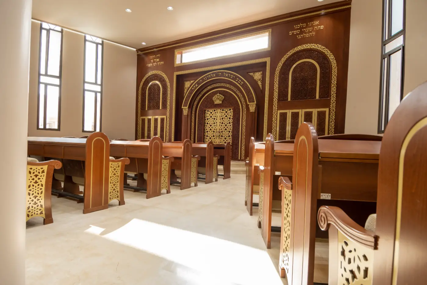 At Atteret HaMizrach Synagogue, we were delighted to install furniture sets adorned with rich gold tones and intricate carvings, designed in collaboration with the project’s architects and crafted in adherence to the exacting standards they set. The eastern wall, featuring a large ark flanked by bookcases, stands as a striking and cohesive unit. The bimah and pews seamlessly complement the overall magnificent design, creating a synagogue remembered for its exceptional beauty.