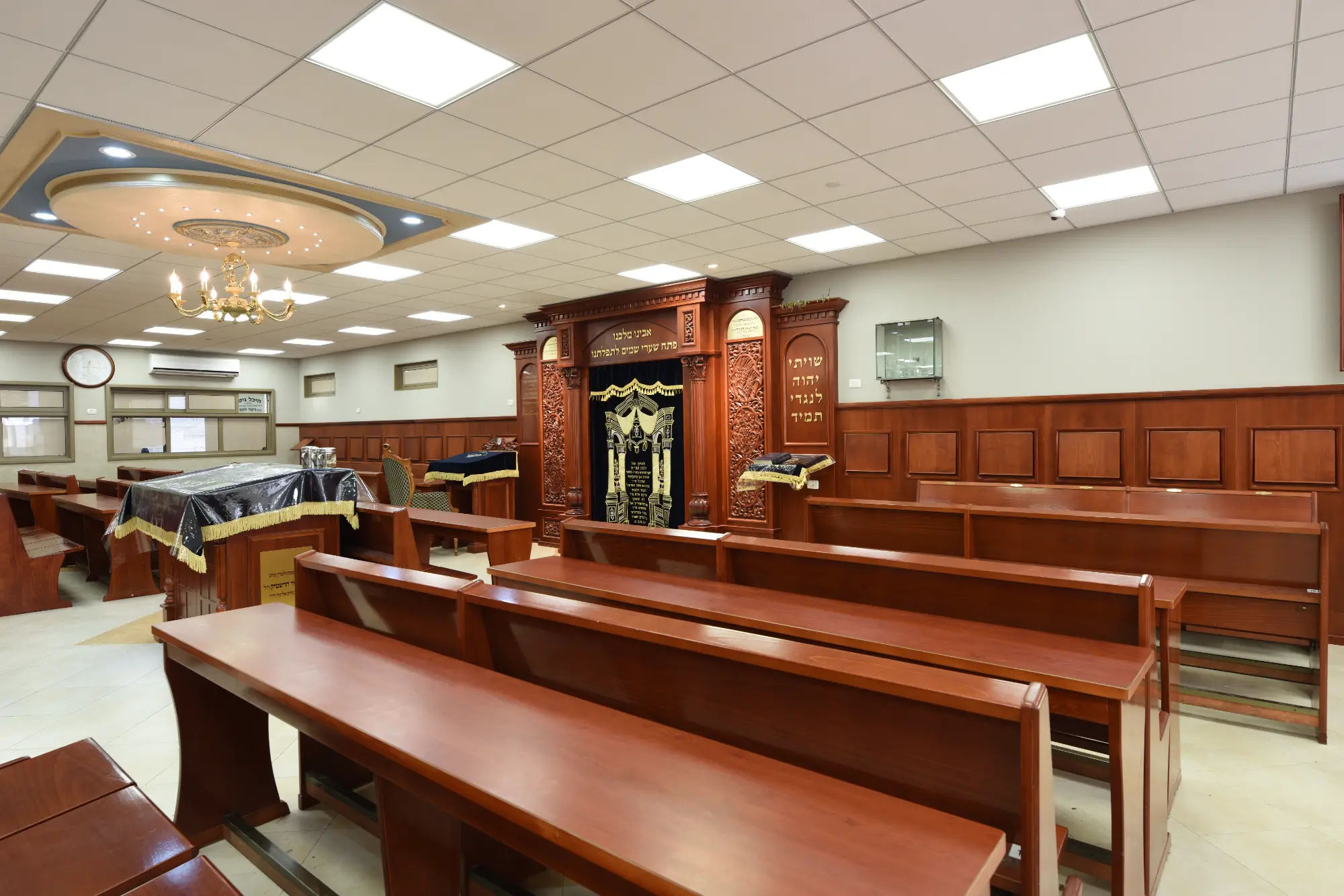 Responding to the yeshiva’s request, for sturdy yet elegant furnishings, we curated a blend of functionality and luxury. The Aron Kodesh, designed in a traditional style, includes round columns adorned with carved capitals and features handmade carvings depicting Shivat Haminim on both sides. Completing the decor are a Torah reading table, stylized Amudei Chazan, and upgraded bookcases with decorative elements. Our choice of benches from the resilient Yeshivati series, known for its durability and strength, along with tables conducive to collaborative study, enhances the overall functionality of the educational space.