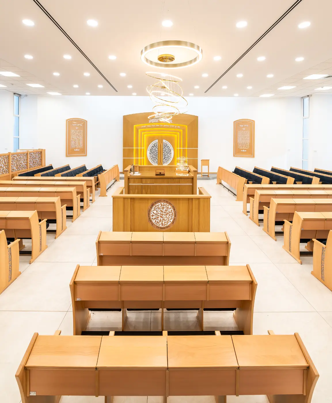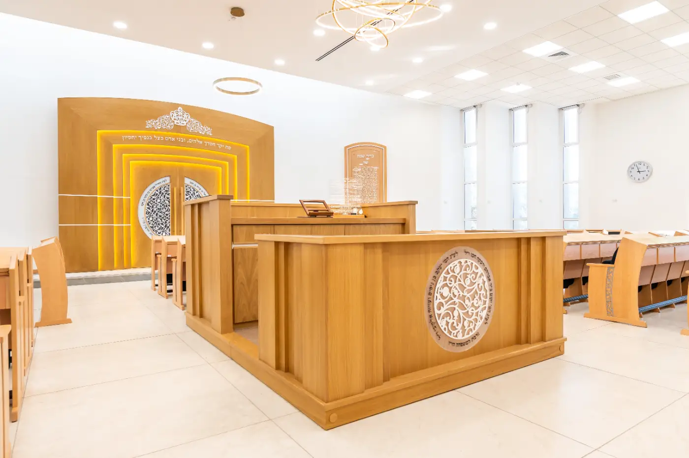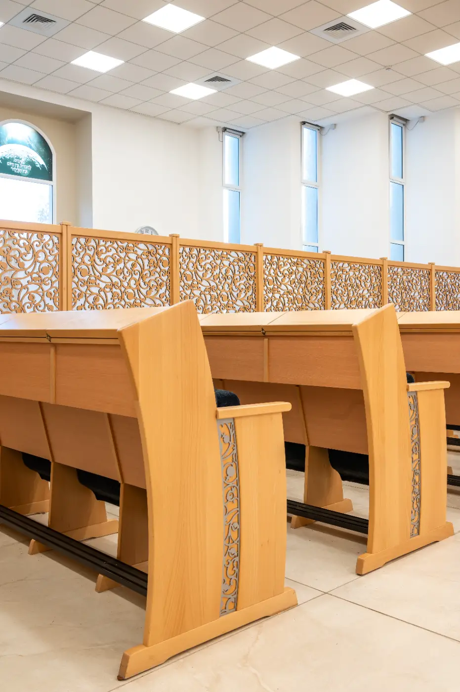 In professional collaboration with the designer Liat Argaman, the products were meticulously tailored to the space and the unique needs of the community. The Aron hakodesh and the teyvah were made from natural oak wood and combined with warm LED lighting, which maintains a bright and pleasant sense of space throughout the day, while the benches, mechitzot, and bookcases were made from beech wood, preserving clean lines and harmony of natural shades.