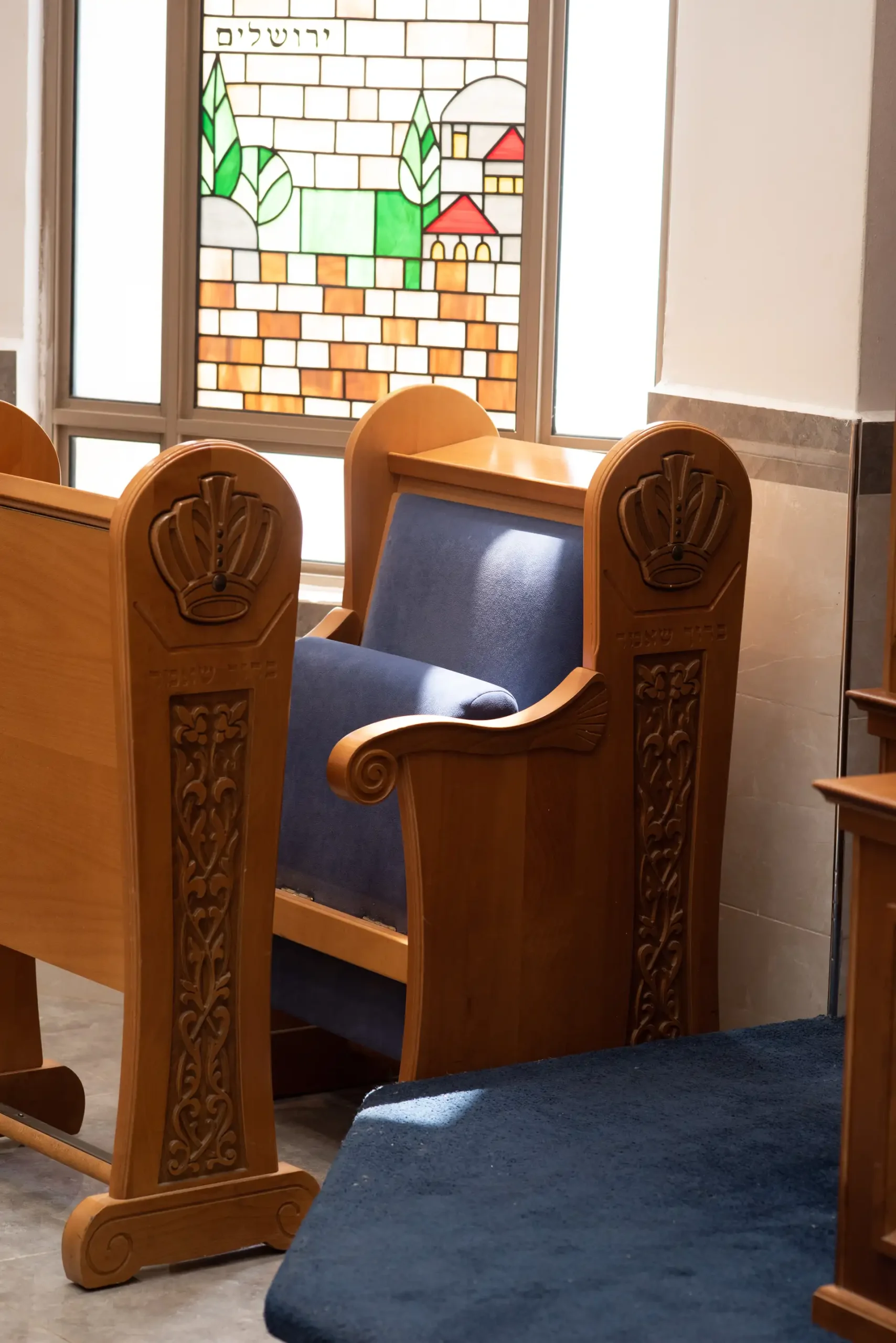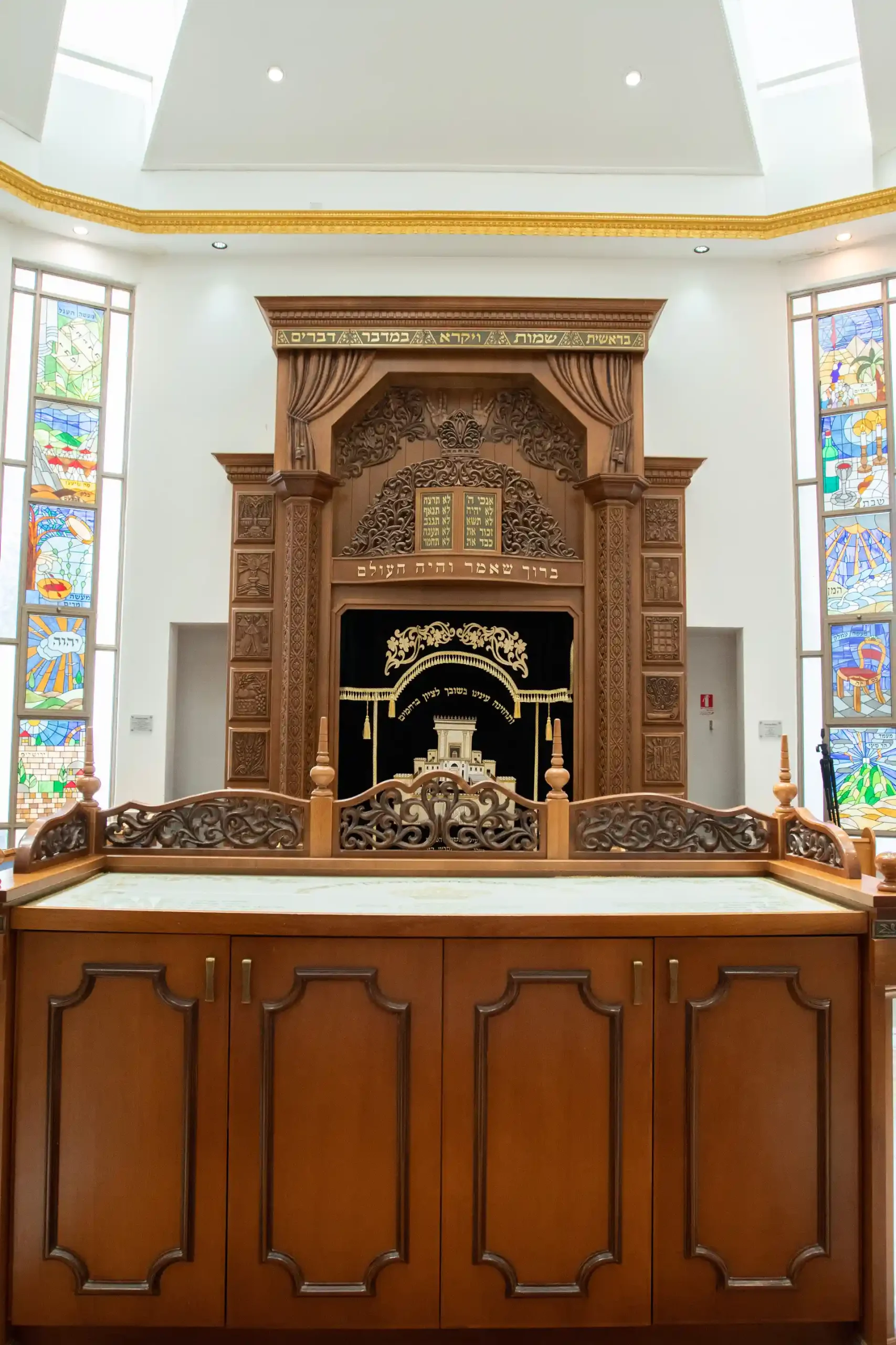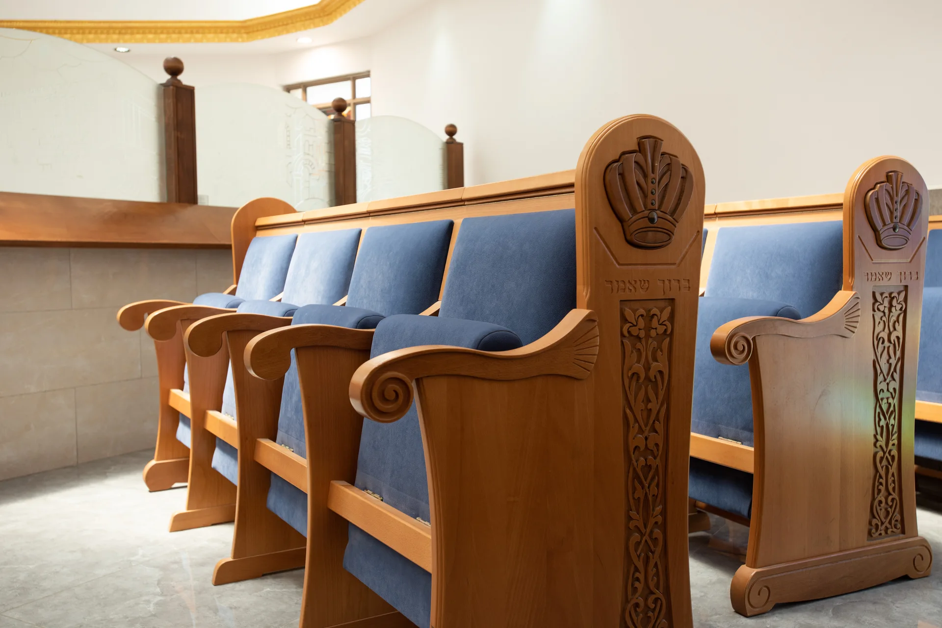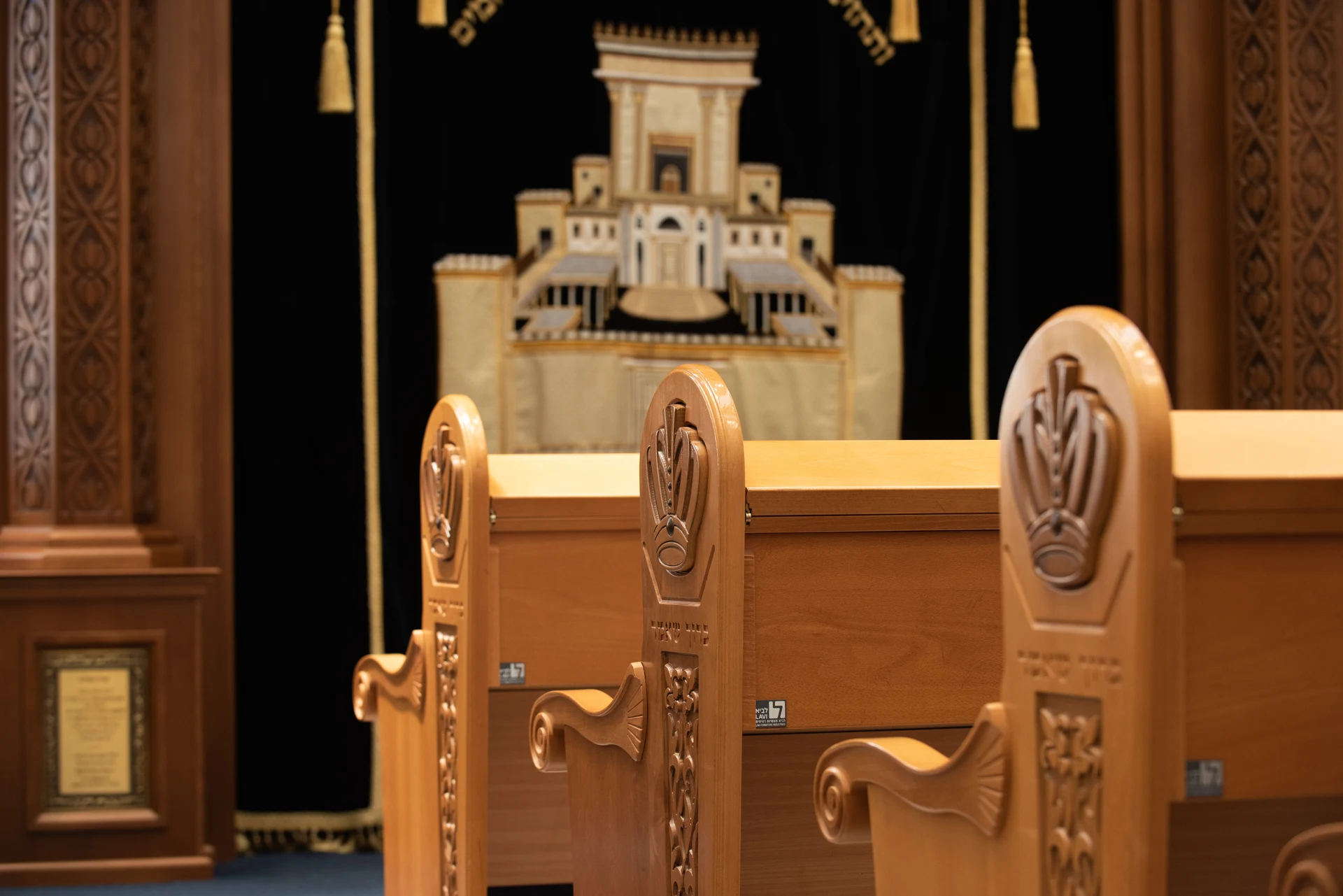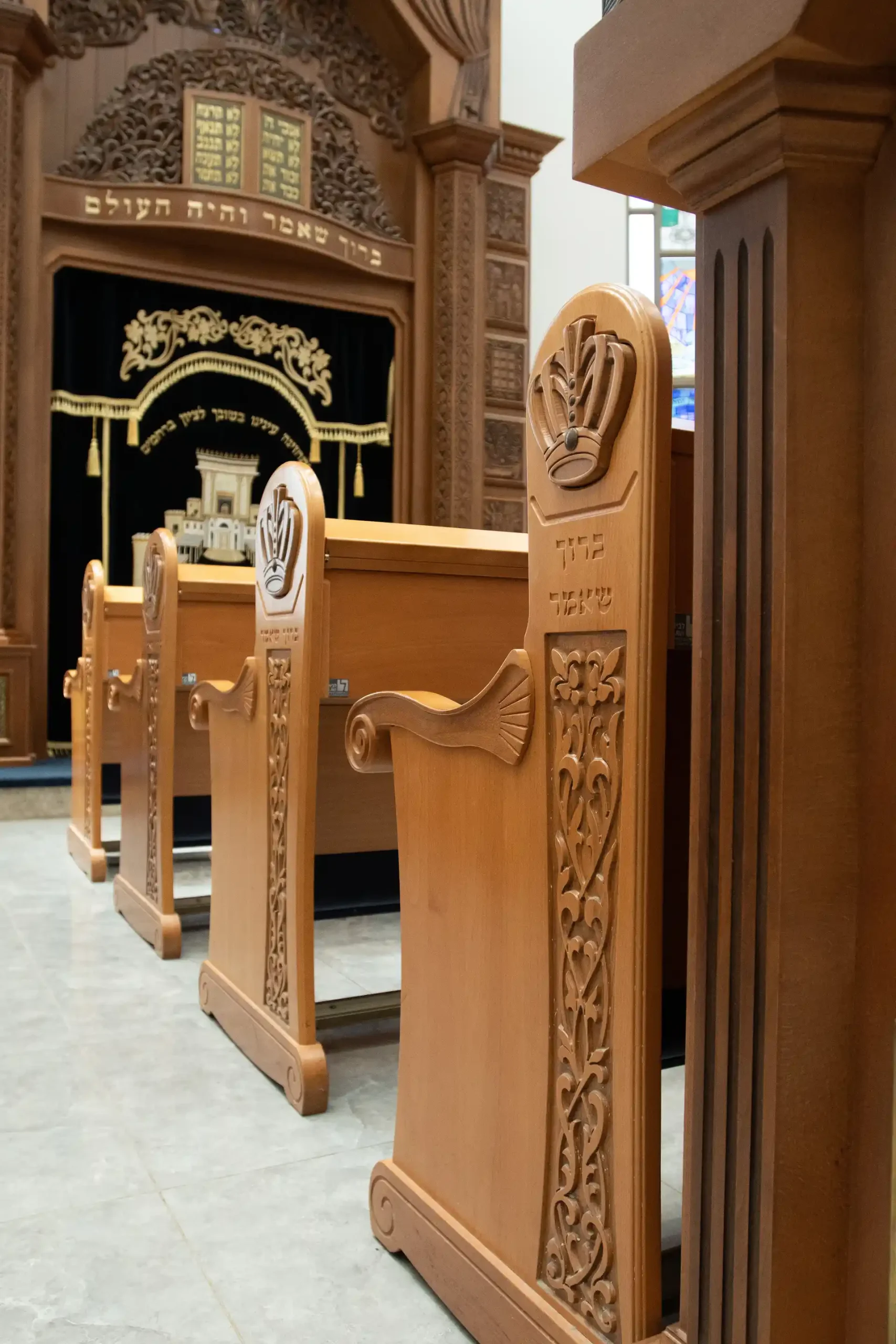 Une décoration artistique sur chaque pied de banc a des implications budgétaires mais pour ce projet, le résultat parle de lui-même : une arche particulière avec une présence qui n’éclipse pas les autres éléments de la synagogue d’un point de vue du design, mais se complètent. Le résultat parle de lui-même!
