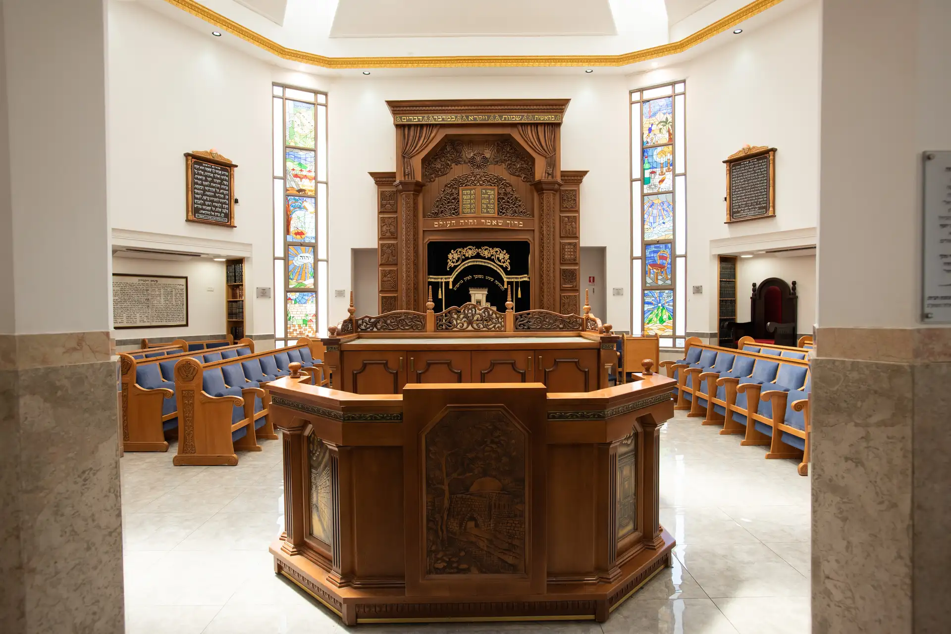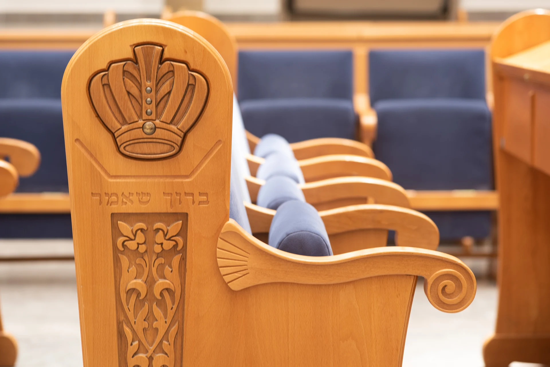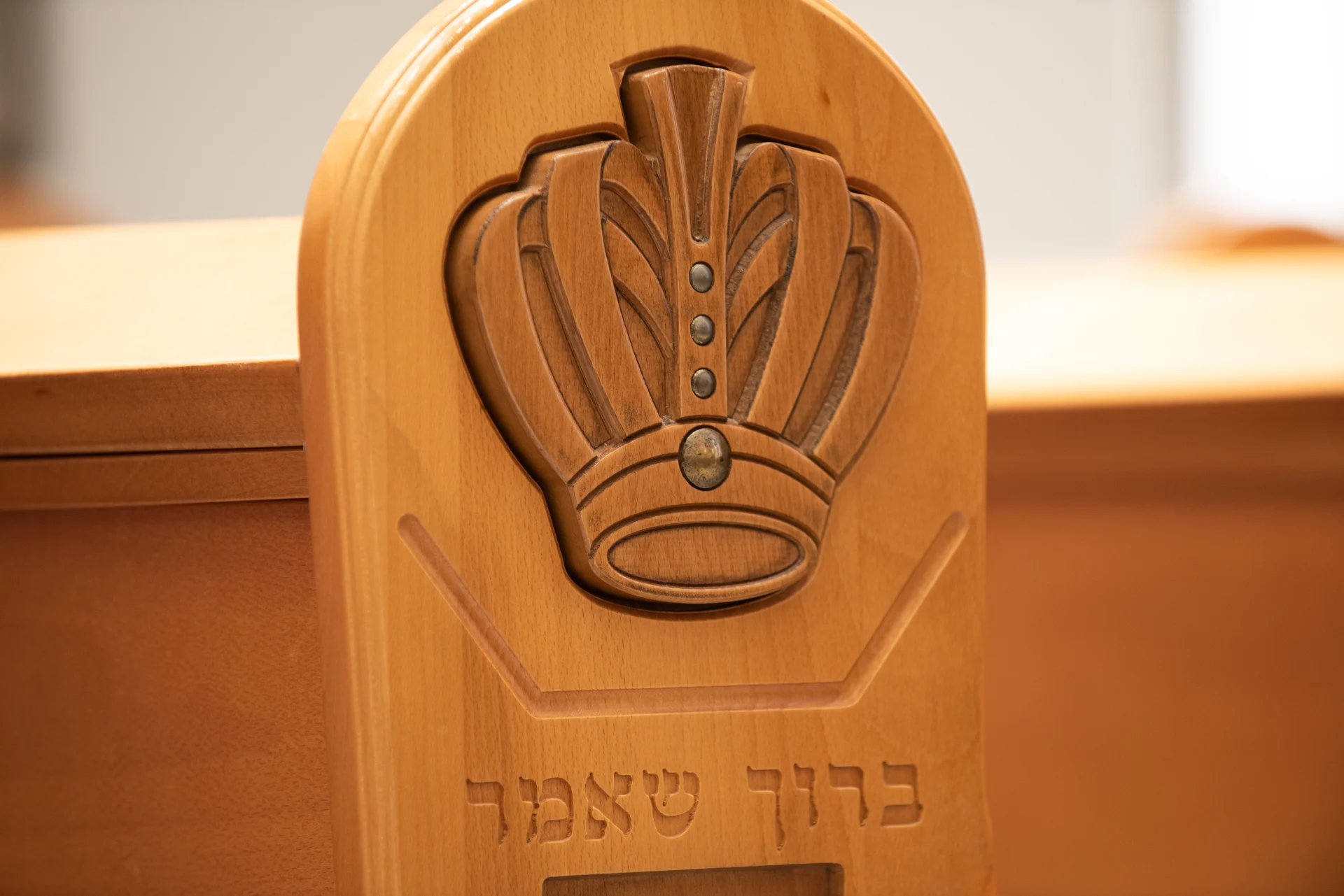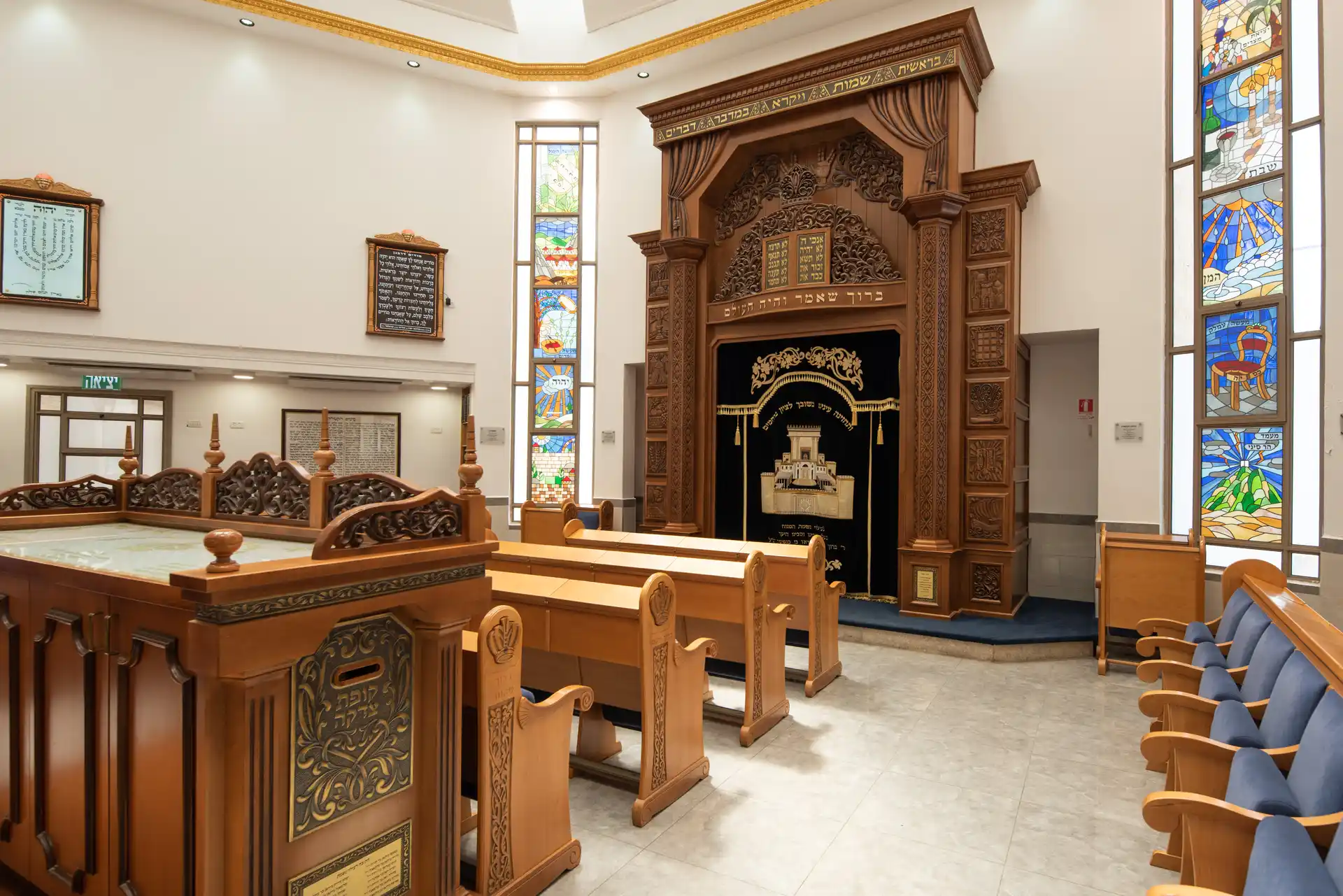 Une décoration artistique sur chaque pied de banc a des implications budgétaires mais pour ce projet, le résultat parle de lui-même : une arche particulière avec une présence qui n’éclipse pas les autres éléments de la synagogue d’un point de vue du design, mais se complètent. Le résultat parle de lui-même!